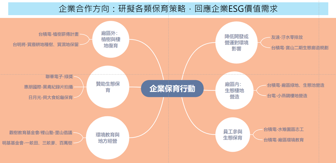 觀察家在企業ESG環境永續策略中協助企業評估環境生態風險與機會,及擬定保育行動等策略實踐。評估面涵蓋企業生物多樣性政策的研擬與諮詢,及TNFD生物多樣性風險評估,提升企業在生物多樣性方面的ESG評等。在實踐層面,協助企業從評估階段到保育行動方案的規劃與執行,並推動公私協力促進企業與當地社區、政府機構及NGO的合作,共同實現生態保護的目標,達成多方共贏,進一步增強企業品牌形象與價值。