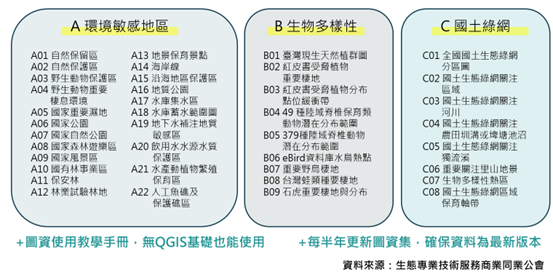 - 協助生態專業技術服務商業同業公會進行「生態地圖包」的資料更新與維護,地圖包目前收錄各機關開放的圖資,將與生態相關的圖層分A.環境敏感地區、B.生物多樣性和C.國土綠網的圖資(圖1),後續也持續協助資料更新與修正。