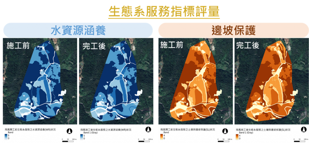 - 我們運用統計分析原理,採正規化(Normalization)、標準化(Standardization)、網格化(rasterized)、相關分析(Correlation analysis)或矩陣分析(matrix analysis)等,將生態調查資料進行統計分析,產出量化評估結果,應用於保育治理工作與效益評估。如水保工程的棲地調繪轉譯為水資源涵養和邊坡保護的量化評估,及保護效益(圖2)。