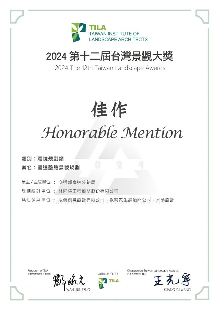 https://daodi.com.tw/zh-TW/works/170 - 國道整體景觀規劃:主辦單位為交通部高速公路局,規劃設計為林同棪工程顧問股份有限公司,榮獲環境規劃類佳作。